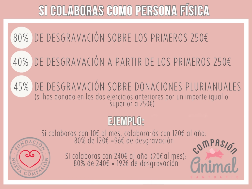 Santuario Compasión Animal ha pasado a ser Fundación Nueva Compasión, así que todas las donaciones que se realicen se desgravan en el impuesto de la renta o en el impuesto de sociedades, según se trate de personas físicas o de empresas.